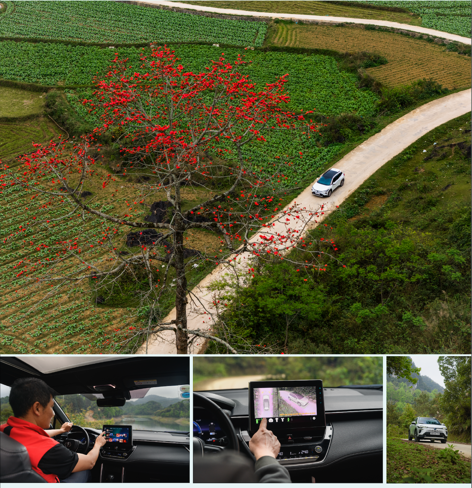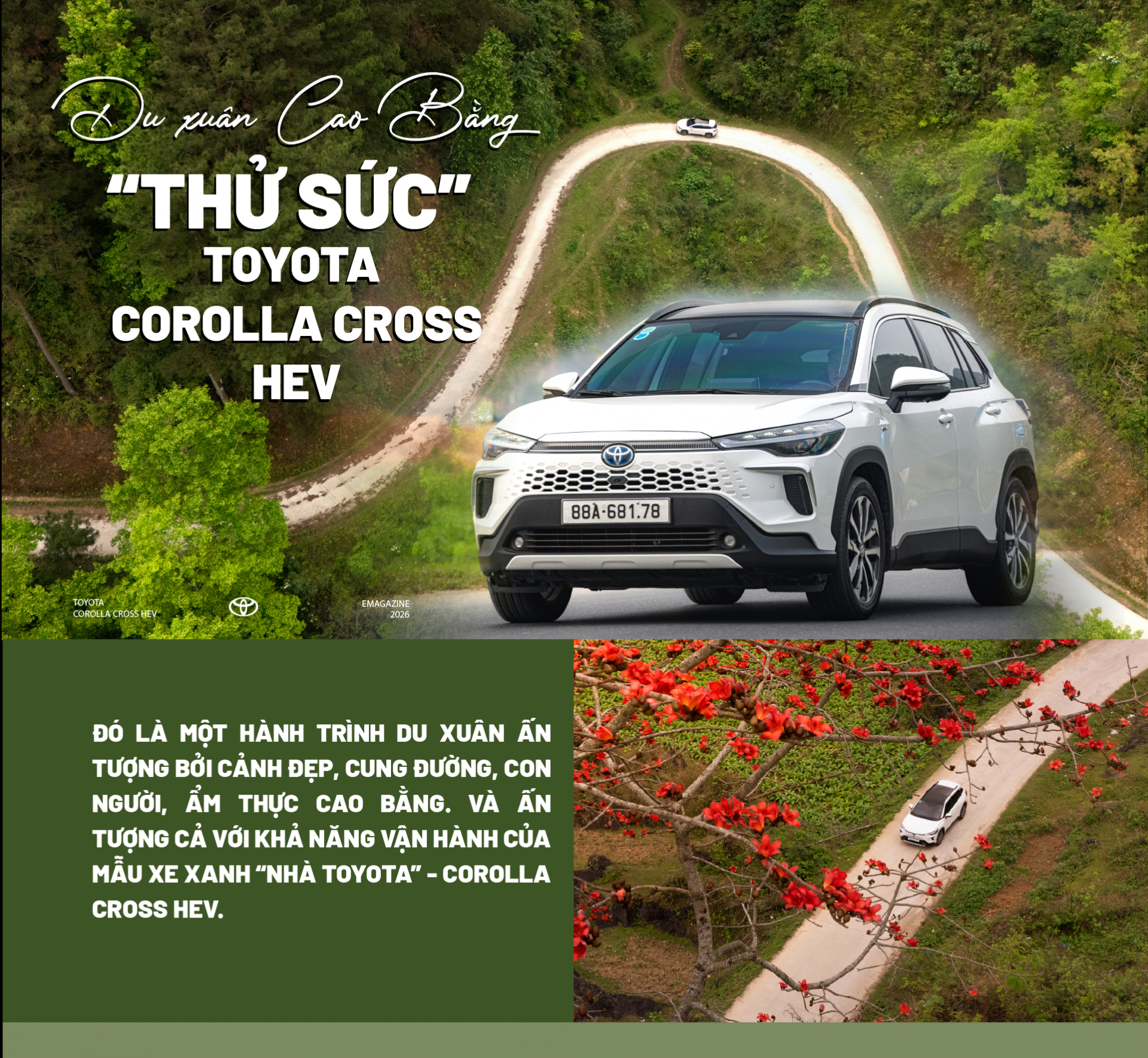 Đây là cái cớ để nhóm 3 người chúng tôi cùng mẫu xe xanh Toyota Corolla Cross HEV thực hiện một cuộc du ngoạn lên với miền biên viễn Cao Bằng. Những ngày giữa tháng 3, khi cái se lạnh vẫn còn vương vấn trong gió núi, cả vùng đất Cao Bằng như khoác lên mình tấm áo hoa rực rỡ: sắc trắng tinh khôi của hoa mận phủ kín Lũng Sâu; sắc hồng phớt mơ màng của hoa đào rừng nở muộn dọc các triền đồi ở Mã Phục, Khau Cốc Trà, hay những bản làng nhỏ bảng lảng khói lam chiều nằm nép mình dưới chân núi dọc con sông Quây Sơn.