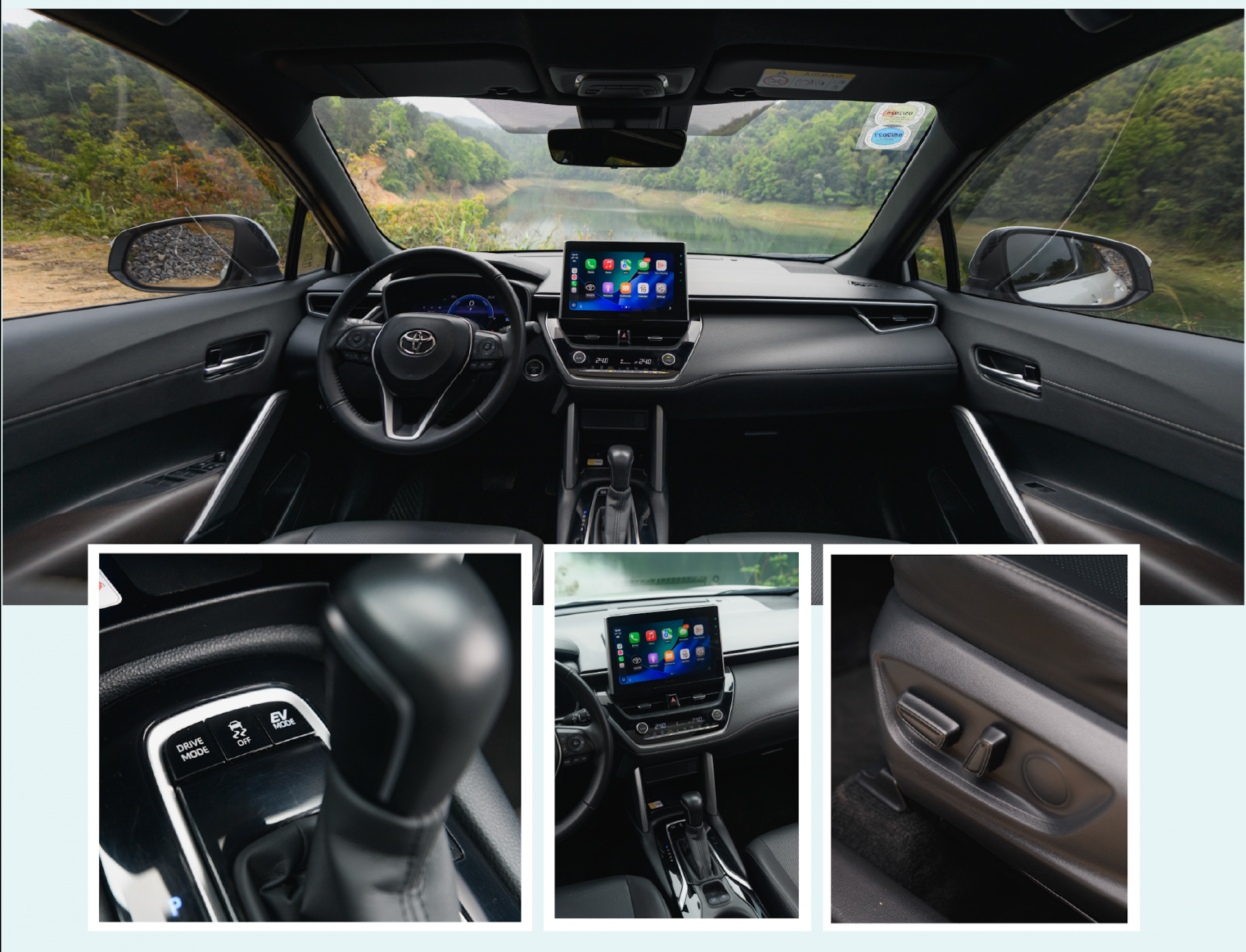 Thật may là Corolla Cross HEV được trang bị hệ thống cảm biến xung quanh xe, camera 360 độ hiển thị 3D trên màn hình trung tâm rõ nét đã giúp chúng tôi đi vào núi một cách dễ dàng dù sát hai bên là hai hàng rào đá. Chưa hết, vô-lăng trợ lực điện cùng với các tính năng cảnh báo điểm mù, cảnh báo phương tiện cắt ngang trước/sau cực kỳ thuận tiện để hỗ trợ người lái.